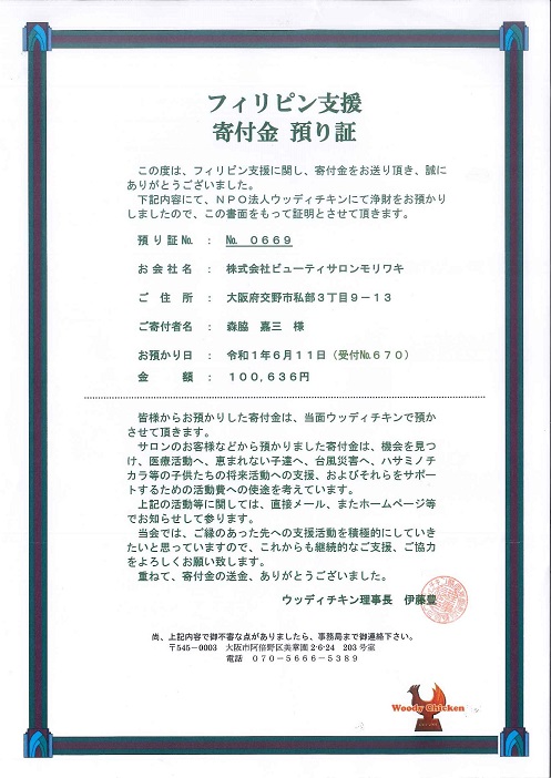 「このたびの豪雨災害で、ウッデイチキンの皆さんのご尽力、ご支援に支えられた美容室が多くいらっしゃると思います。現在はプレハブや工事中の店内で仮営業をしているサロンがほとんどです。それを森脇会長にお話したら『 まずは目の前のお仕事から始められるよう、大きな事は出来ませんが協力します』と言ってくださって (涙)、感謝しております」(幹部)
