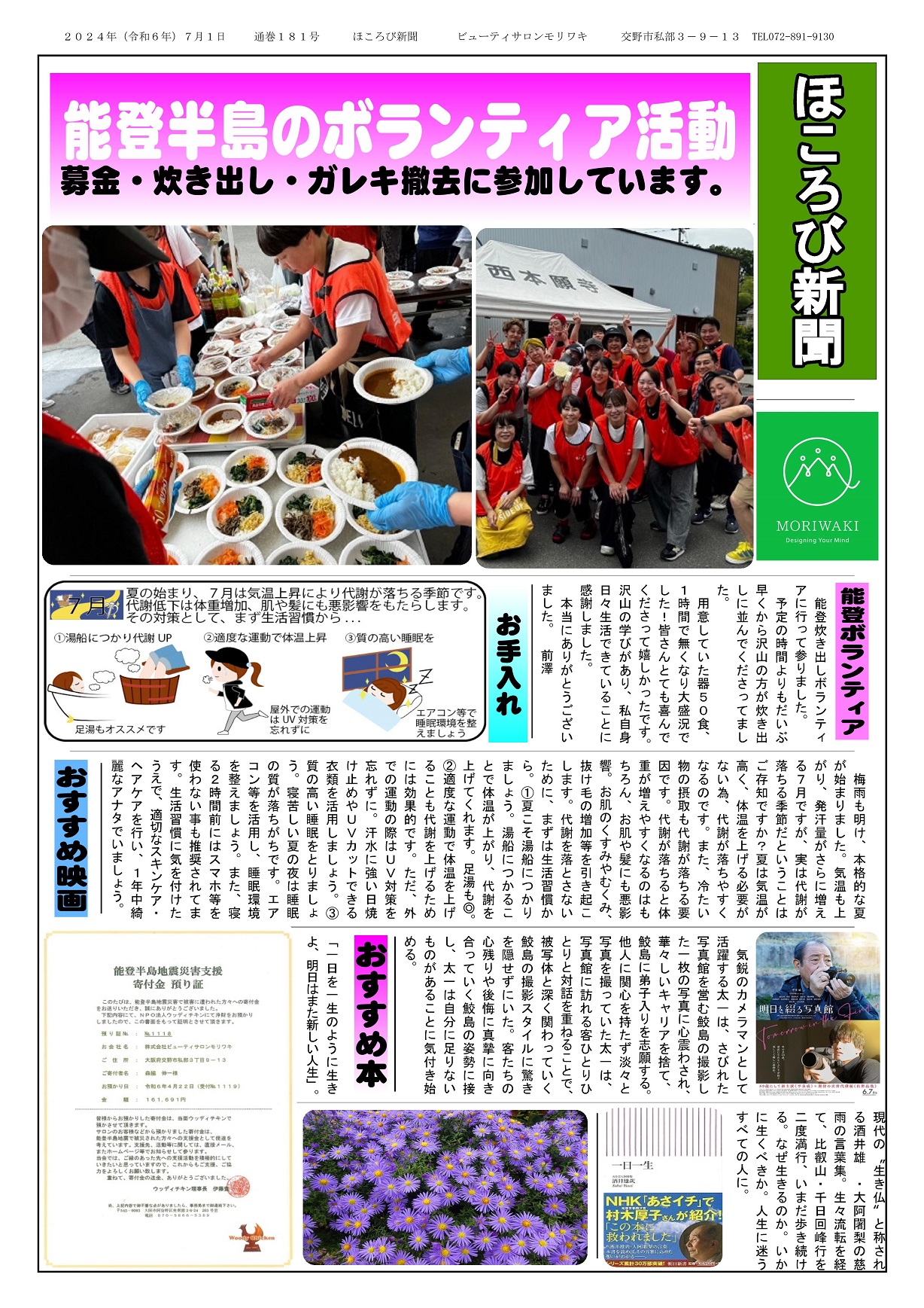 「経営者もスタッフも、やさしい会社づくりの行動を自然にできるよういつも心がけています。今回も被災サロンの『がんばろう』という気持ちをちょっとでも応援できたら嬉しく、できる範囲で支援させていただきました」(森脇会長)